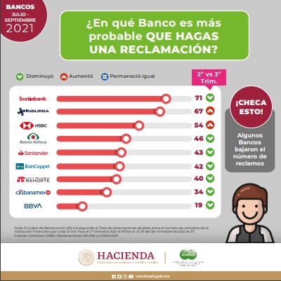 En cuanto al tiempo que tardan en resolver los bancos una queja, la información aclara que de julio a septiembre de 2021, el promedio del sector fue 18 días hábiles, mejorando en relación al segundo trimestre que fue de 23 días.  “Los bancos que más se tardan en resolver una queja son: Scotiabank con 24, seguido de Banorte con 23 y Santander con 22”.