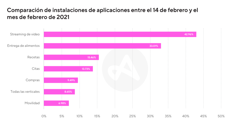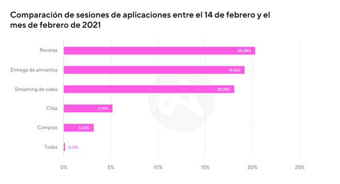 Otro plan para estar con esa persona que hace latir tu corazón, es hacer un maratón de películas románticas y de acuerdo con Adjust, las instalaciones de apps de streaming fueron un 43% más altas el día de San Valentín que el promedio mensual. Además, las sesiones de conexión también aumentaron un 18%, lo que demuestra que esta opción es una de las favoritas.