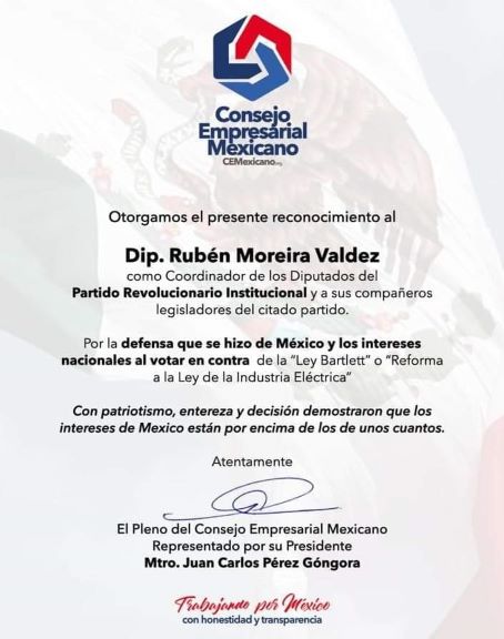A su vez, el presidente del Consejo Empresarial Mexicano (CEMexicano), Juan Carlos Pérez Góngora, dirigió reconocimientos escritos a los coordinadores del PRI, PAN, Movimiento Ciudadano y PRD en la Cámara de Diputados, Rubén Moreira Valdez, Jorge Romero Herrera, Jorge Álvarez Máynez y Luis Espinoza Cházaro, respectivamente, así como a sus compañeros legisladores de cada partido.