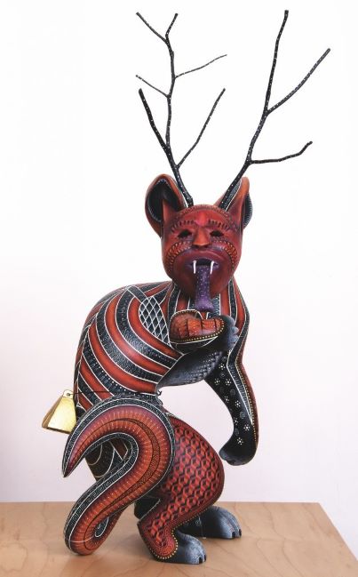 La exposición Detrás de una máscara reúne una serie de piezas talladas en madera de copal elaboradas por Jacobo Ángeles y María Mendoza, maestros artesanos originarios de la comunidad de San Martín Tilcajete, en la región de los Valles Centrales de Oaxaca.