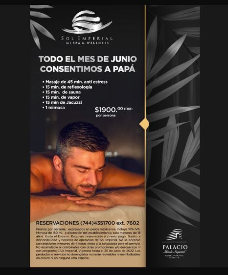 Y para consentir a los “héroes del hogar” Grupo Mundo Imperial contará con la disposición de sus spas Tlalli Clínica Spa y Spa Sol Imperial en Princess y Palacio Mundo Imperial respectivamente para darle el descanso que cada uno se merece, mediante masajes únicos con tarifas especiales: