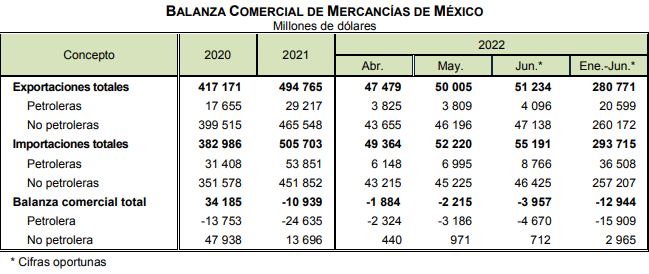 En los primeros seis meses de 2022 la balanza comercial de México presentó un déficit de 12 mil 944 millones de dólares (mdd), pues mientras las exportaciones de mercancías sumaron 280 mil 771 mdd, el valor de las importaciones fue de 293 mil 715 mdd.