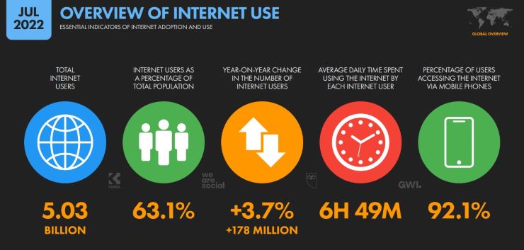 Este estudio también expone que el número de usuarios en internet creció en 178 millones, o un 3.7%, más respecto al 2021. Lo anterior representa unos 5 mil 30 millones de usuarios de internet a nivel global, lo que significa que la penetración de internet es del 63.1% de la población mundial. El 90.7% de los internautas se conectan a la web con un smartphone, 60.3% usan su laptop o computadora y un 28.2% usa tablets.