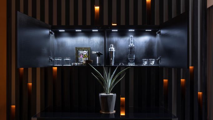 Estos espacios, ideados con el objetivo de generar experiencias memorables, cuentan además con elementos exclusivos y de fabricación nacional, entre los que se encuentran los escritorios y la decoración de los muros. Además ofrecen un Snack Bar con alimentos acordes a las bebidas que se ofrecen, un Hangover Kit para la recuperación de aquellos que disfrutan de toda una noche de fiesta y un Bar Setup con botellas, sales, shaker que despertarán la faceta de mixólogo de cualquier persona.