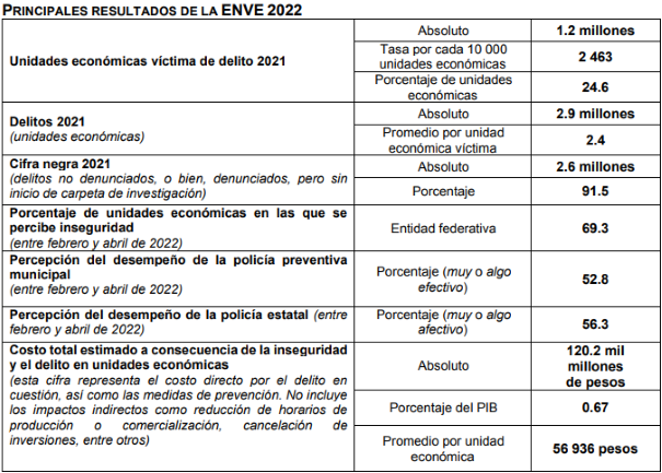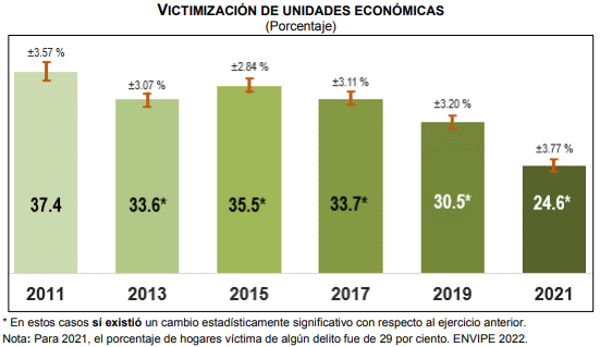 El organismo dio a conocer hoy la Encuesta Nacional de Victimización de Empresas (ENVE) 2022, la cual destaca: «Durante ese año (2021), se estima que 24.6 por ciento de las unidades económicas del país fue víctima de algún delito, lo que equivale a 1.2 millones de unidades económicas víctimas. En 2019, la estimación fue de 30.5 por ciento».