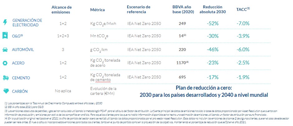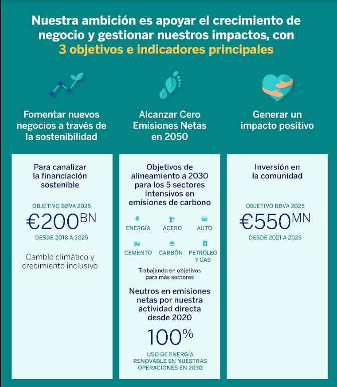 En 2019, BBVA incorporó la sostenibilidad como una de sus prioridades estratégicas y en 2021 anunció la creación del área global de Sostenibilidad. En dicho año, la entidad anunciaba su objetivo de suprimir su exposición a clientes del carbón en 2030 en los países desarrollados y en 2040 globalmente (en los términos indicados en el Marco Ambiental y Social de BBVA). Posteriormente fijó objetivos intermedios para descarbonizar su cartera en cuatro sectores intensivos en emisiones en 2030, unos sectores que, junto al carbón, representaban el 60% de las emisiones de CO2 mundiales.