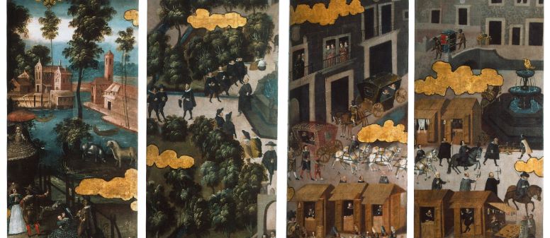Estas representaciones vistas de ciudades, saraos y pintura de castas, cuantitativamente, son mucho menos frecuentes en la producción de una escuela de pintura a la que, por regla general, se relaciona con elaborar representaciones dedicadas a la historia sagrada, a los santos y otros aspectos de la doctrina cristiana, destinando sus magnas empresas a la pintura de retablos o la ornamentación de templos y conventos, para así facilitar a personas comunes tener una vía que permite imaginar lo trascendente con las ventanas abiertas por la gracia de la pintura.