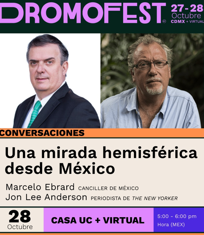 Marcelo Ebrard, internacionalista y político mexicano titular de la Secretaría de Relaciones Exteriores participará en una charla exclusiva con el periodista Jon Lee Anderson, especialista en política latinoamericana y en conflictos modernos como parte de las actividades de Dromofest 2022.