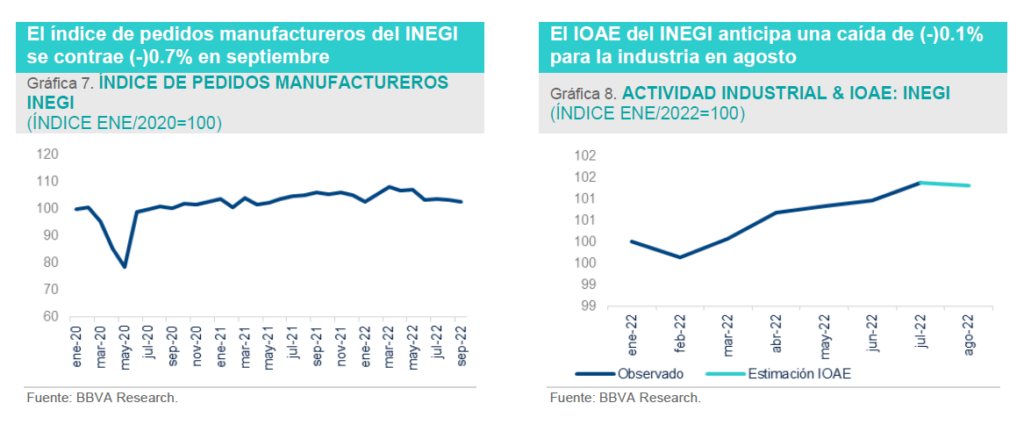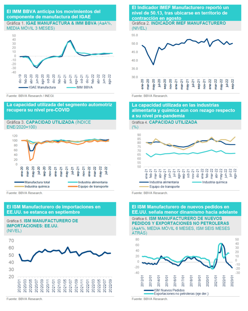 El Indicador Multidimensional de la Manufactura BBVA (IMM BBVA)[1], creció 8.1% en septiembre (AaA), 1.2 pp por arriba de la variación observada el mes previo (6.9%). El crecimiento moderado del sector señala la resiliencia de la manufacturera doméstica ante un desempeño mejor al esperado en el sector industrial de EE.UU. en el mismo mes (vis a vis otros componentes de la oferta que muestran ya deterioro); no obstante, los indicadores de nuevos pedidos manufactureros en México y EE.UU. apuntan hacia una desaceleración en los siguientes meses, en un entorno de debilitamiento de la demanda ante los altos precios y una política monetaria más restrictiva. El promedio de la variación interanual del IMM BBVA en 3T22 asciende a 6.7%, por debajo del 7.2% registrado en 2T22, lo que señala una ralentización con respecto al trimestre previo. Por su parte el Indicador IMEF manufacturero reportó un nivel de 50.13, tras ubicarse en territorio de contracción en agosto (49.49).
