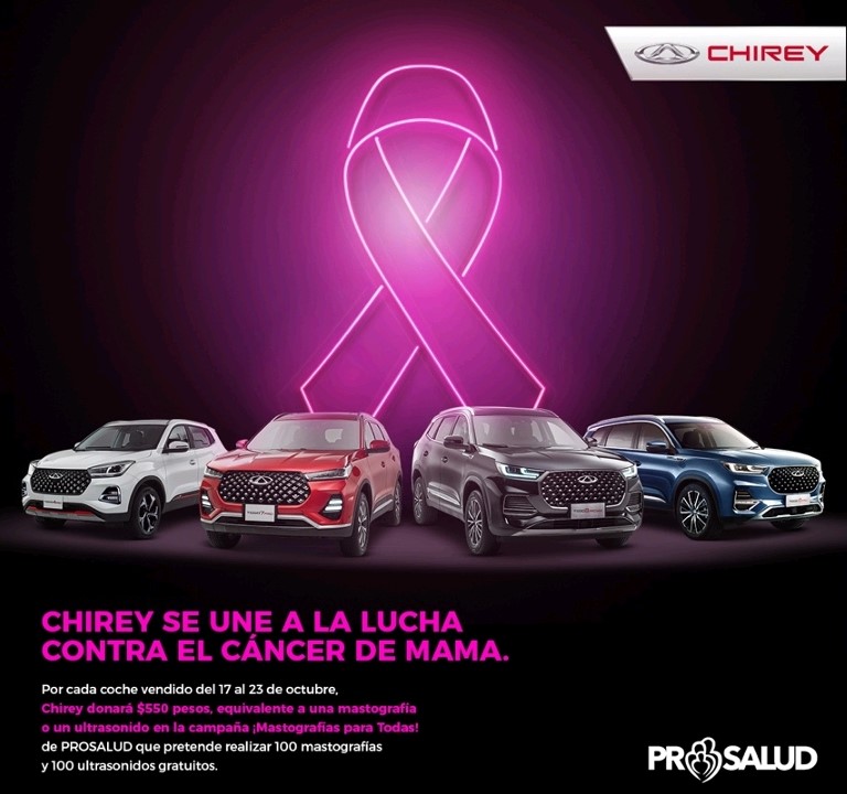 De esta manera, Chirey se solidariza con la sociedad mexicana y PROSALUD en su objetivo de brindar 100 mastografías y 100 ultrasonidos totalmente gratuitos.