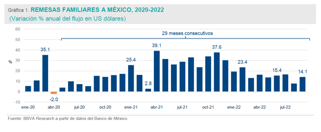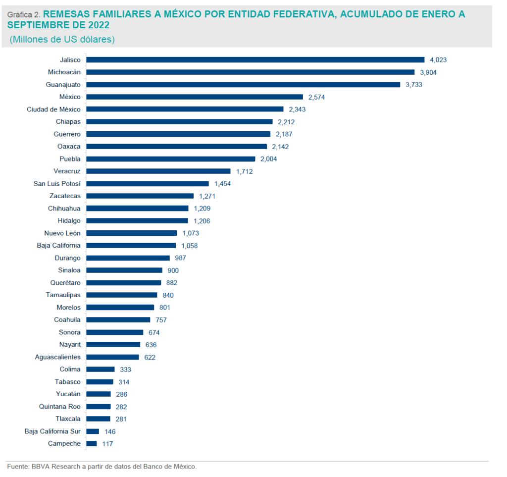 Jalisco (4,023 md), Michoacán (3,904 md) y Guanajuato (3,733 md) se mantienen como los estados que más reciben remesas en el país. En los últimos dos años destaca el fuerte crecimiento de este flujo monetario hacia Chiapas: entre 2020 y 2021 las remesas crecieron 65.7%, y durante los primeros 9 meses del año tienen un crecimiento de 67.1% respecto al mismo periodo del año previo. Chiapas ocupaba la 14ª posición en 2020 entre los estados que más recibieron remesas, en 2021 ascendió al 10º lugar, y en lo que va de 2022 ya ocupa la 6ª posición. Es posible que el flujo de remesas que perciben los migrantes para su tránsito en México expliquen parte de este crecimiento.