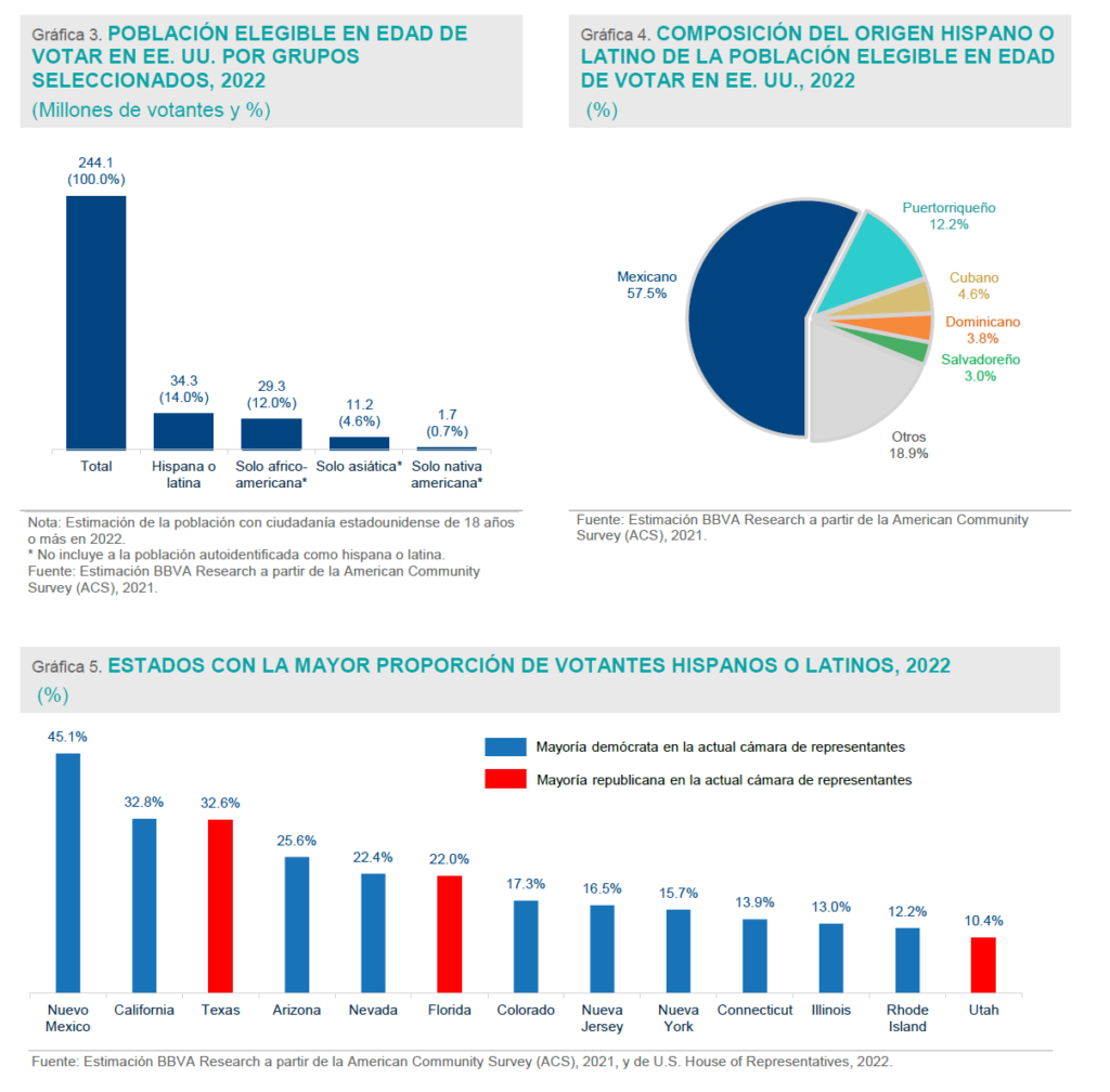 De la población autoidentificada como hispana o latina elegible para votar se encuentra que 57.5% declara que tiene origen mexicano, que incluye a los migrantes nacidos en México naturalizados en Estados Unidos y a la población nacida en la Unión Americana que indica que tiene ascendencia mexicana (migrantes de segunda generación y tercera y más generaciones). Le siguen en orden de importancia la población de origen puertorriqueño, cubano, dominicano y salvadoreño.