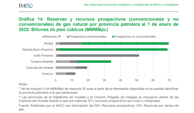 «Los recursos no convencionales se encuentran en tres provincias petroleras al noreste del país (en los estados de Coahuila, Nuevo León, Tamaulipas y el norte de Veracruz, principalmente). Estas son Sabinas-Burro-Picachos (67.0 MMMMpc), Burgos (53.8 MMMMpc) y Tampico-Misantla (20.7 MMMMpc)», aclara dicho documento con fecha 30 de agosto de 2022, donde aparecen como autores Diego Díaz y Oscar Ocampo.