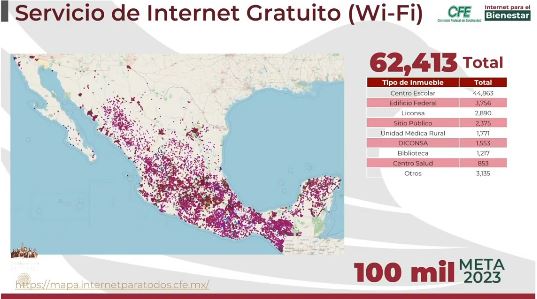 Actualmente hay 62 mil 413 puntos de internet gratuito en todo México y se prevé que para finales de 2023 «van a llegar hasta 100 mil», según informes del director general de CFE Telecomunicaciones e Internet para Todos (CFE TEIT), David Pantoja Meléndez, quien participó hoy en la conferencia mañanera en Palacio Nacional.