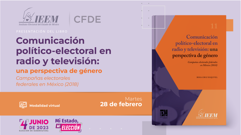Este 28 de febrero, a través del canal oficial de YouTube del Instituto Electoral del Estado de México (IEEM), el Centro de Formación y Documentación Electoral (CFDE) presentará el libro Comunicación político-electoral en radio y televisión: Una perspectiva de género. Campañas electorales federales en México (2018), de Irma Cruz Esquivel, quien es Maestra en Administración Electoral por el IEEM.