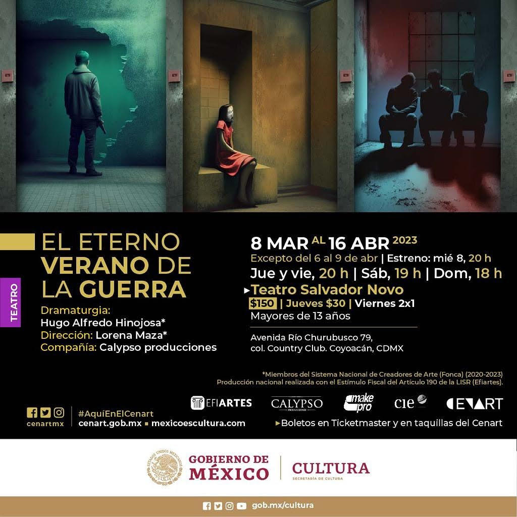 El Centro Nacional de las Artes (Cenart), institución de la Secretaría de Cultura del Gobierno de México, será sede del estreno de la obra El eterno verano de la guerra, escrita por Hugo Alfredo Hinojosa y escenificada por la compañía Calypso Producciones, bajo la dirección de Lorena Maza. Se trata de una puesta en escena que representa el umbral al submundo, al horror de la condición humana que se repite una y otra vez. Tiene como contexto una realidad que duele tocando temas tan delicados como la trata de personas, la prostitución, la migración y la guerra –tanto literal como interna– que viven los personajes y comparten con el público.