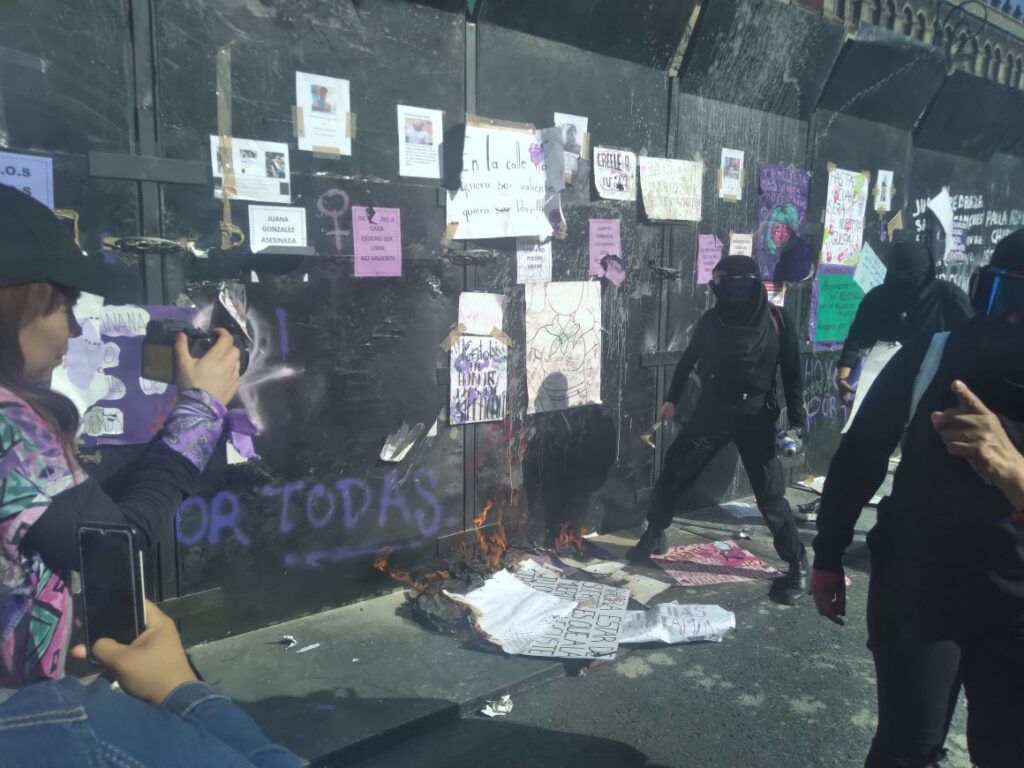 Algunas prendieron fuego a papeles a un lado de la coraza de acero colocada alrededor del mencionado palacio; en tanto, otras luchaban para tratar de derribar dichas cercas; además, expresaron insultos contra el Gobierno.