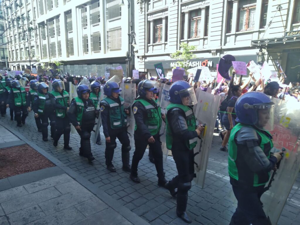 En medio de un fuerte dispositivo de seguridad, con policías con escudos y cascos, las mujeres avanzaron en calles como Juárez, Eje Central Lázaro Cárdenas y 5 de Mayo hasta llegar al Zócalo, donde el Palacio Nacional estaba protegido con vallas metálicas, al igual que la Catedral.