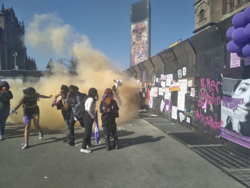 Este Día Internacional de la Mujer, en la Ciudad de México decenas de féminas golpearon con martillos, palos, pies y manos, las vallas metálicas que protegen el Palacio Nacional y la Catedral Metropolitana, mientras desde adentro les lanzaron un polvo amarillo para tratar de contenerlas.