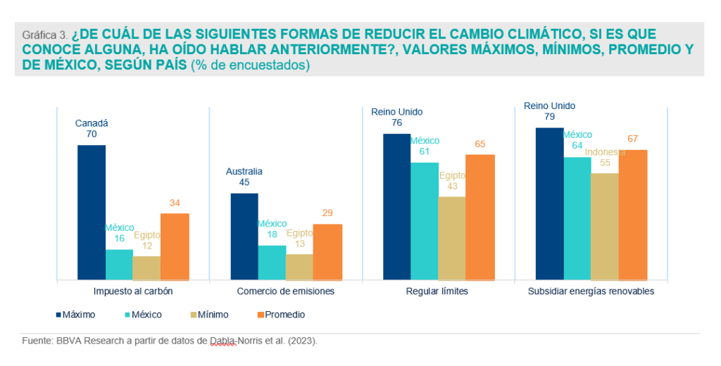 Sólo el 16% de las personas en México habían oído hablar de los impuestos al carbono, 18% del comercio de emisiones, 61% de la regulación para limitar emisiones y 64% de los subsidios a energías renovables.