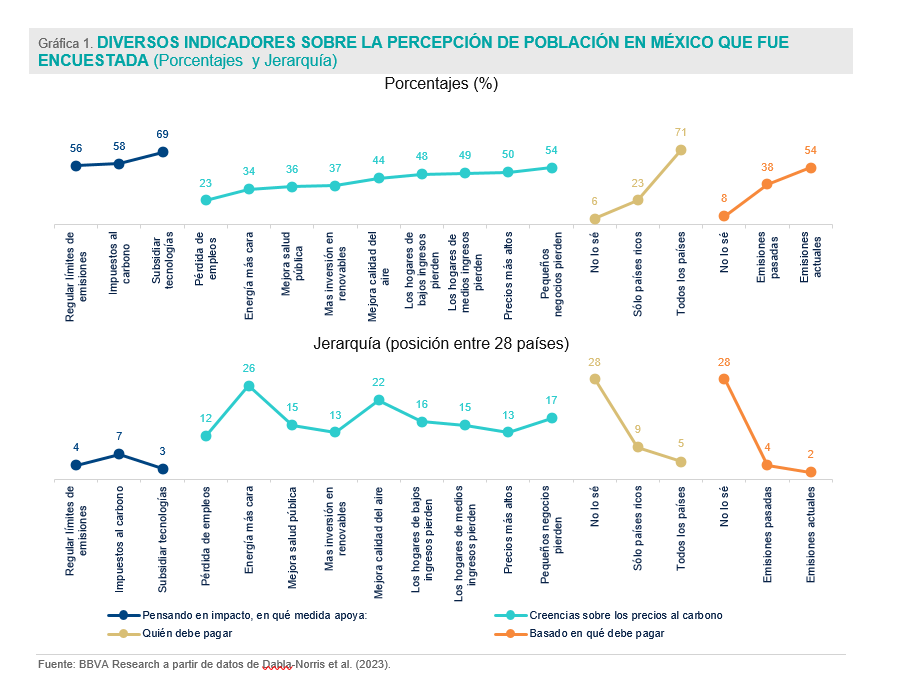 Si se consideran respuestas a preguntas sobre los costos y beneficios sobre las implicaciones distributivas de la tarificación del carbono, alrededor de la mitad de los encuestados en México opinó que los hogares de ingresos bajos (48%) y medios (49%) perderían, el 50% opinó que podrían generar precios más altos y el 54% que los negocios pequeños podrían perder con esta política. Mientras que el 44% respondió que mejoraría la calidad del aíre y el 37% que habría más inversión en renovables.