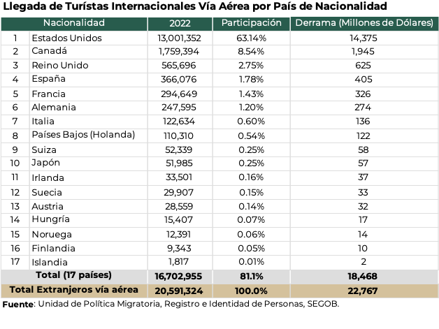 Informó que de los 17 países que ingresan a México con pasaporte con chip, durante 2022 arribaron 16.7 millones de turistas internacionales vía aérea, que representan un 81.1% del total de países que arribaron a México, con una derrama económica de 18 mil 468 millones de dólares.