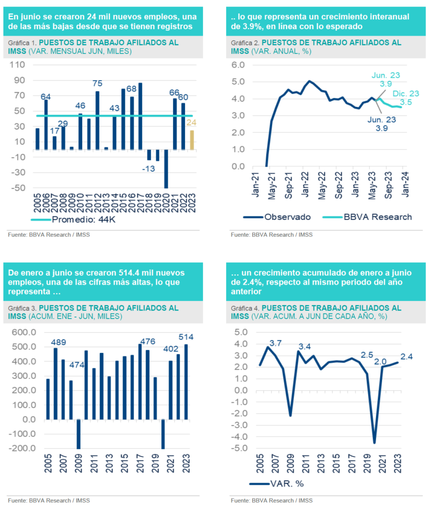 Conforme a lo esperado, el empleo formal se desaceleró en junio, con un crecimiento mensual de 0.1%, cifra 0.2pp inferior a la del mismo mes en los dos últimos años, lo que representa una variación neta de sólo 24 mil empleos; en términos interanuales, el crecimiento fue de 3.9%, en línea con el pronóstico de BBVA Research. Si bien estos resultados representan una de las creaciones de empleo más bajas desde 1998, en cifras acumuladas de enero a junio el empleo formal presenta un crecimiento de 2.4%, todavía superior en 0.2 puntos porcentuales respecto al año anterior, por lo que, a pesar de esta desaceleración, el mercado laboral formal se mantiene fuerte.Nuestra perspectiva de creación de empleo para cierre de año, consistente con el crecimiento esperado de la economía, es que muestre una tendencia de menor crecimiento durante los siguientes meses, pero que gane tracción durante el tercer trimestre del año de forma transitoria por factores estacionales, por lo que mantenemos sin cambios nuestro pronóstico de creación de empleo a cierre de año, pero con cierto sesgo positivo. Para esto será clave la resiliencia que siga mostrando el consumo y/o la dinámica del sector manufacturero.