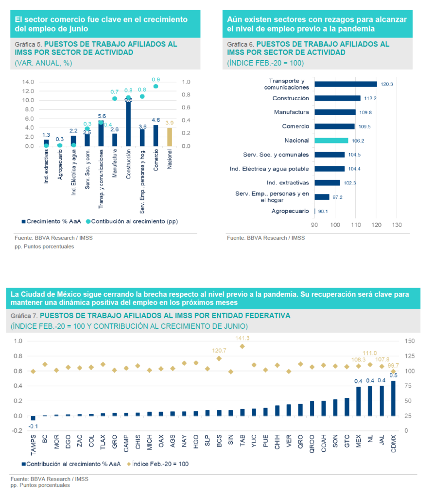 A nivel estatal la Ciudad de México y Tamaulipas son los únicos estados que continúan por debajo del nivel de empleo previo a la pandemia. La Ciudad de México tuvo la mayor contribución al crecimiento interanual en junio con 0.5pp. En variación mensual se desaceleró la creación de empleo (0.02%), pero por ser la entidad con mayor generación de empleo tiene un efecto importante en la creación de empleo a nivel agregado, por lo cual será clave dinamizar el mercado laboral con efectos positivos relevantes a nivel agregado.