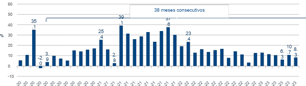 Las remesas logran una racha de 38 meses consecutivos con crecimiento, iniciada desde mayo de 2020, promediando un incremento anual de 16.9%.
