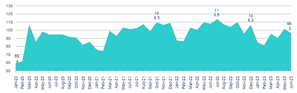 En junio de 2023, los hogares mexicanos recibieron 96,300 millones de pesos por concepto de remesas. En términos reales, este monto es mayor a lo percibido durante enero y febrero de 2023; pero es 15.1% inferior al monto máximo de poder adquisitivo que lograron alcanzar en julio de 2022.