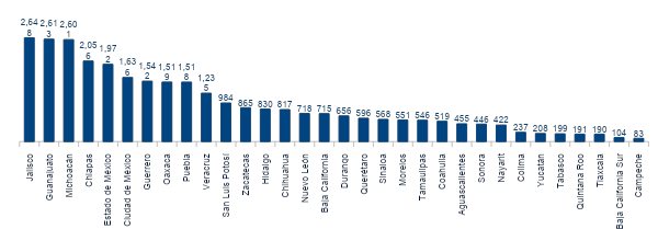 Jalisco se mantiene en primer lugar como el estado que más recibió remesas en el país con 2,648 millones de dólares durante los primeros seis meses del año. Es seguido por Guanajuato, en segundo lugar, con 2,613 millones de dólares durante este mismo periodo, y en tercer lugar se ubica Michoacán con 2,601 millones de dólares. Nuestras estimaciones indican que cada uno de estos tres estados cerrarán 2023 con flujos anuales de remesas superiores a 5,000 millones de dólares. Destaca la dinámica observada en el estado de Guanajuato, lo que le ha permitido desplazar a Michoacán al tercer puesto, y de mantenerse su ritmo de crecimiento observado (+9.4% anual) podría convertirse a finales de año en la entidad que más reciba remesas a nivel nacional.