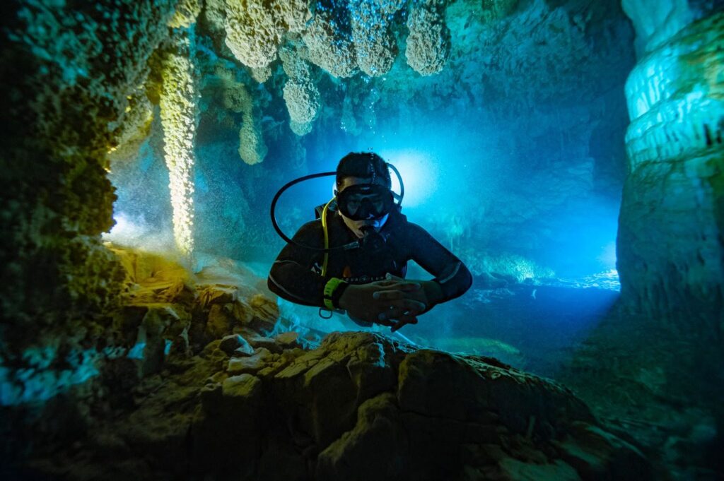 En los cenotes, también es posible bucear, estos rincones llenos de misticismo y que de acuerdo con las leyendas mayas son la puerta de entrada al inframundo en donde los colores y las largas raíces de árboles que buscan el preciado líquido que les da vida te envuelven de la magia del Munda Maya.
