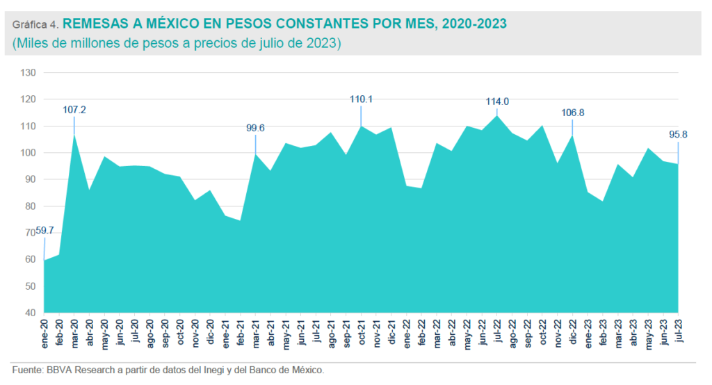 En julio de 2022, el poder adquisitivo del flujo de remesas al país alcanzó su mayor nivel, con un equivalente a 114,000 millones de pesos constantes a precios de julio de 2023. Para este último mes, julio de 2023, las remesas al país sumaron 95,800 millones de pesos. De esta forma, en términos de pesos reales, las remesas a México han perdido en un año 16.0% de su poder adquisitivo.