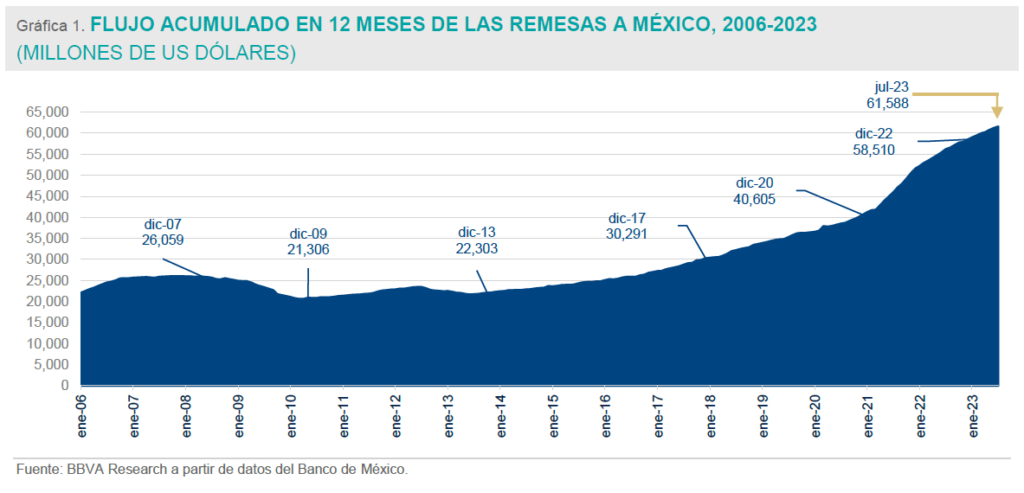 De forma anualizada, las remesas acumulan en 12 meses un flujo de 61,588 md, el mayor volumen en su historia, con una tasa de crecimiento de 9.6%.