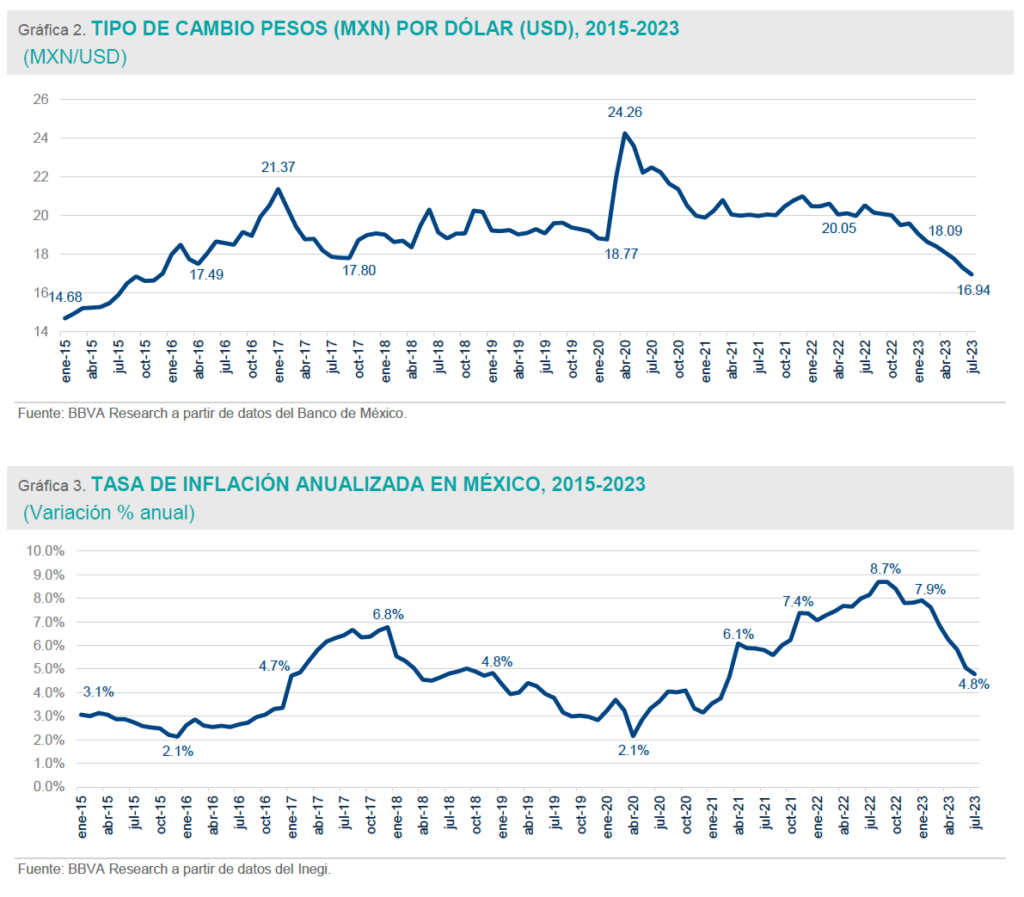 Pese a que el flujo de remesas en dólares a México se ubica en sus mayores niveles, el superpeso y la inflación merman el poder adquisitivo de los hogares receptores de estos recursos. Entre julio de 2022 y julio de 2023 el peso presentó una apreciación de 17.4%, pasando de 20.53 a 16.94 pesos por dólar en promedio; mientras que la inflación en México medida por el Índice Nacional de Precios al Consumidor (INPC) fue de 4.8% en este mismo periodo.