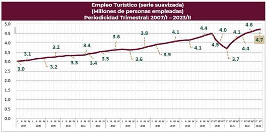 El secretario de Turismo del Gobierno de México, Miguel Torruco Marqués, dio a conocer que la población ocupada en el sector turístico en México ascendió a 4 millones 713 mil personas empleadas en el segundo trimestre de 2023.