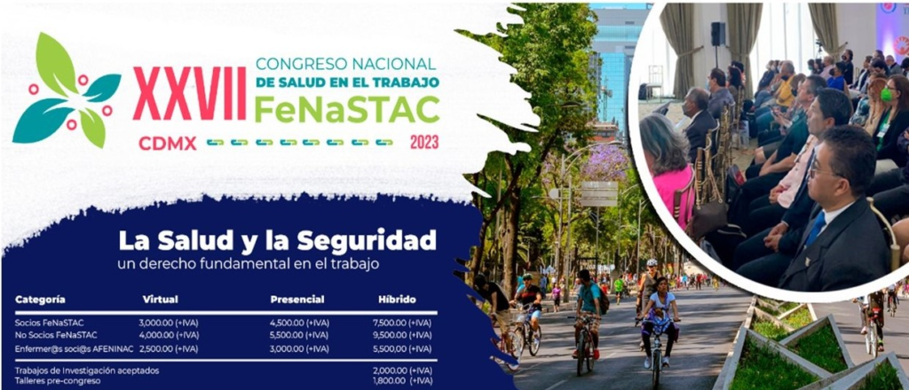 La Federación Nacional de Salud en el Trabajo A.C. (FeNaSTAC), organización que agrupa asociaciones, sociedades y colegios, cuyo objeto social se relaciona con la salud en trabajo en el territorio nacional, anunció la realización del XXVII Congreso Nacional de Salud en el Trabajo que se llevará a cabo en la Ciudad de México del 13 al 16 de septiembre, en el hotel Fiesta Americana Toreo.