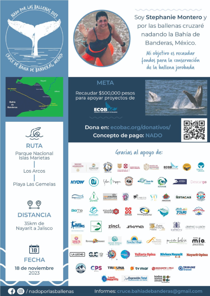 El “Cruce de Bahía de Banderas” es parte del “Primer nado por las Ballenas México 2023”, evento organizado por Stephanie Montero, Karina Almanza, Yoselin Gloria y Maricarmen Sierra, el cual se encarga de recaudar fondos para la conservación de la ballena jorobada en México. Se estableció como meta recolectar $500,000.00, del cual hasta el momento se han logrado $407,113.00.