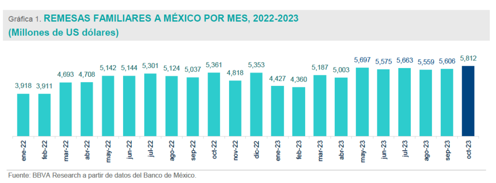 Las remesas a México tuvieron un aumento de 8.4% en el mes de octubre de 2023, llegando a 5,812 millones de dólares (md) y marcando un récord en la recepción de estos recursos. Así, hilan una racha de 42 meses consecutivos con crecimiento, iniciada desde mayo de 2020.