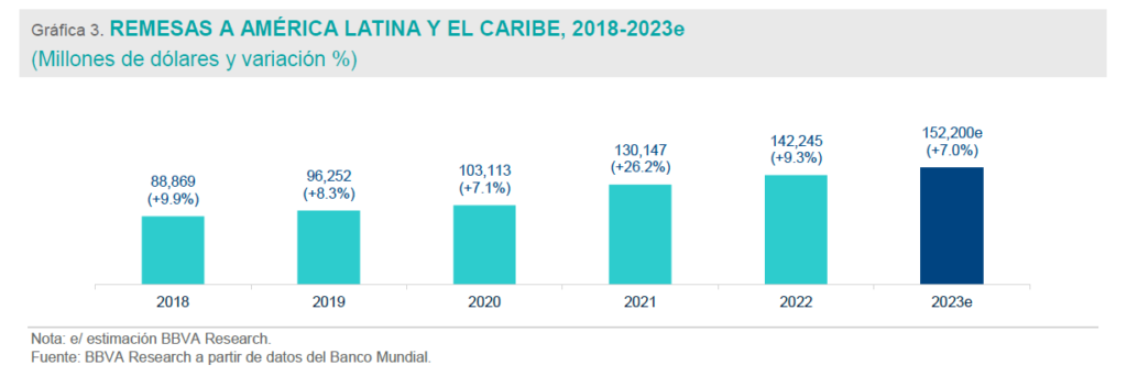 La gran mayoría de los países en América Latina y el Caribe tendrán aumentos en sus ingresos por remesas. BBVA Research presenta las siguientes estimaciones para el cierre de 2023: