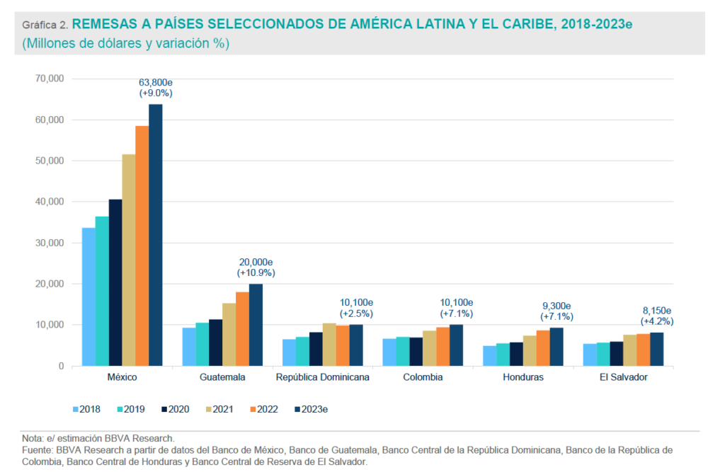 México (63,800md, +9.0%), Guatemala (20,000md, +10.9%), República Dominicana (10,100md, +2.5%), Colombia (10,100md, +7.1%), Honduras (9,300md, +7.1%) y El Salvador (8,150md, +4.2%).