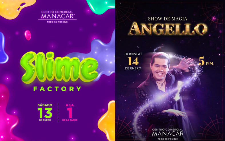 Este sábado 13 de enero, el centro comercial Manacar se llenará de Slime para chicos y grandes a partir de las 13:00 y hasta las 18:00 hrs. teniendo un gran momento de diversión y magia para toda la familia y amigos. Y el domingo 14 llega la magia con el “Show de magia de Angello” en punto de las 17:00 hrs.