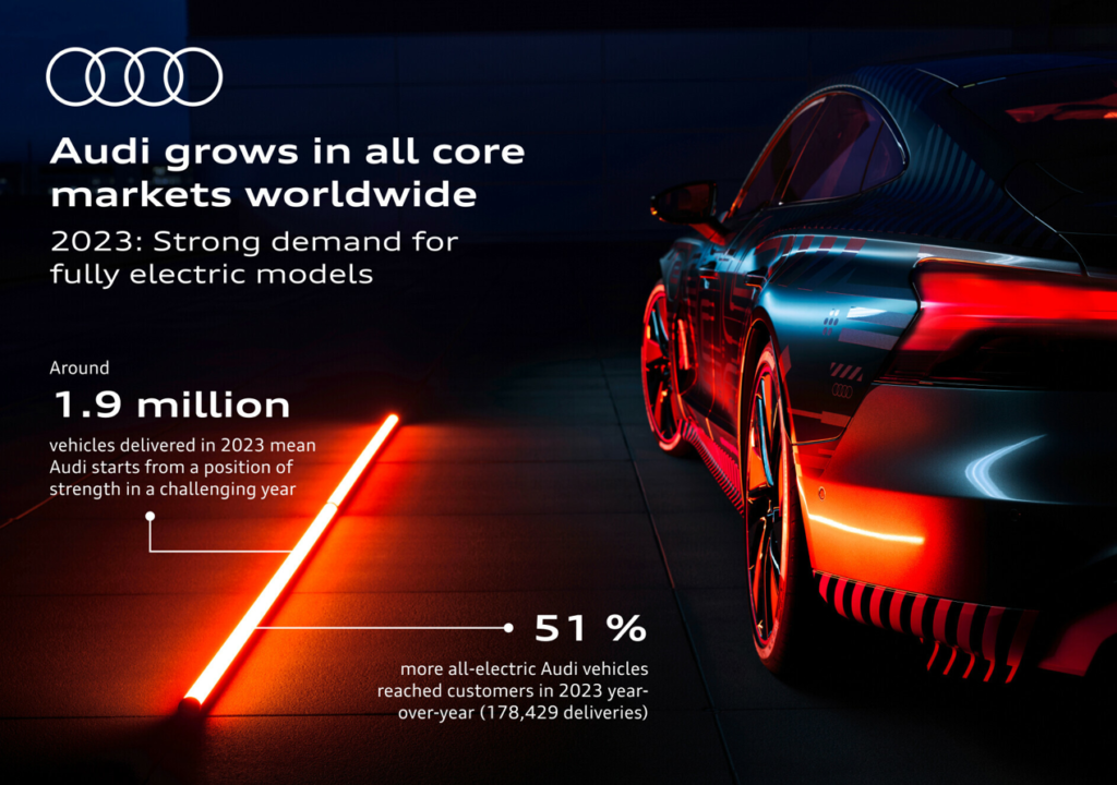 En 2023, Audi aumentó las entregas en todas las regiones del mundo y mostró un crecimiento superior al del mercado global. En particular, el fuerte crecimiento de la demanda de modelos totalmente eléctricos confirma la coherente estrategia de electrificación de la compañía.