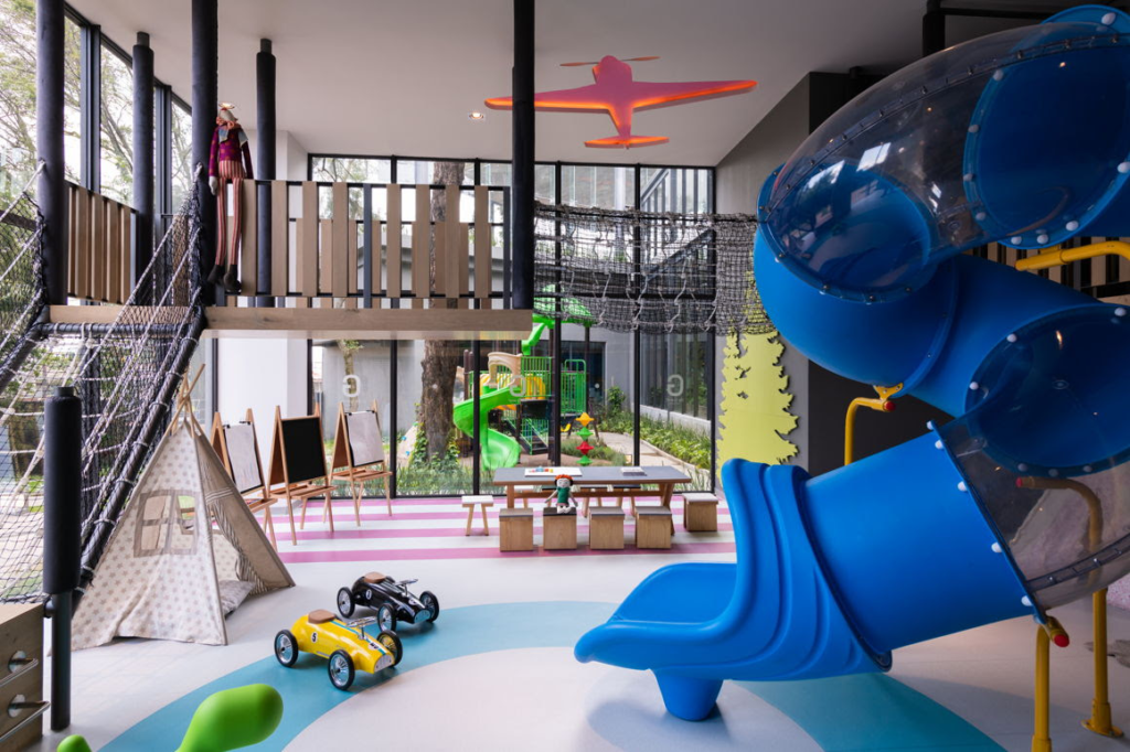 Áreas infantiles. Los complejos residenciales se han dado cuenta de la importancia de crear espacios seguros y divertidos para los más pequeños de la familia. Teniendo en cuenta esto, Be Grand Park Bosques cuenta con sus amenidades de Kid’s Club y Kid’s Garden, espacios infantiles bien diseñados, equipados con juegos interactivos, columpios y estructuras de escalada, ofreciendo el entorno perfecto para que los niños jueguen y socialicen con otros niños del complejo. Además, estas áreas proporcionan a los padres la tranquilidad de que sus hijos están entretenidos y seguros cerca de casa.