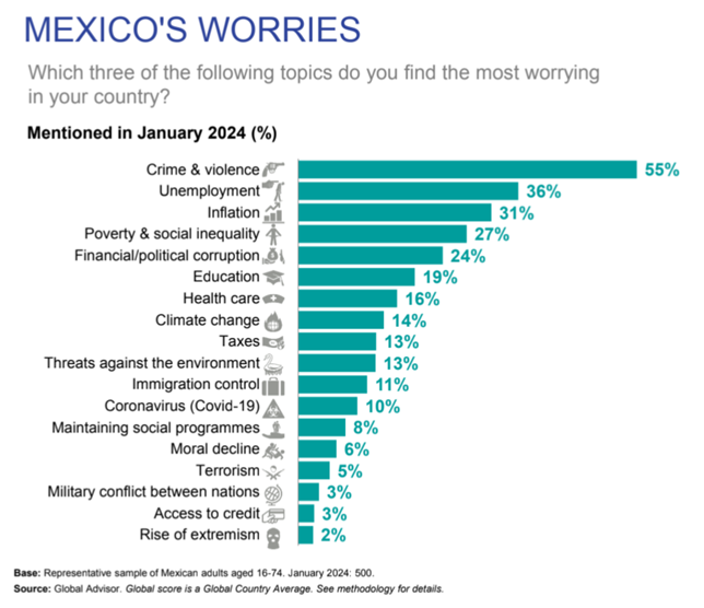 Para los mexicanos, las principales preocupaciones cambian un poco con respecto a los promedios globales, teniendo en primer lugar el crimen y la violencia con más de la mitad de los encuestados (55%), seguido por el desempleo (36%), la inflación (31%), la pobreza y desigualdad (27%) y la corrupción política-financiera (24%).