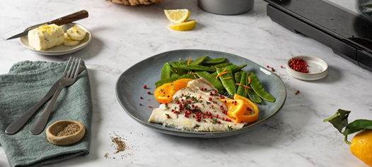 Filetes de dorada y tirabeques al vapor con mantequilla de cítricos