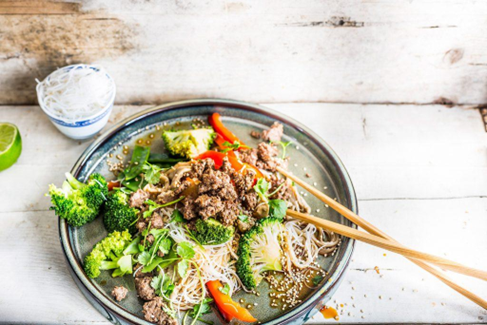 Ensalada asiática de fideos transparentes con ternera picada