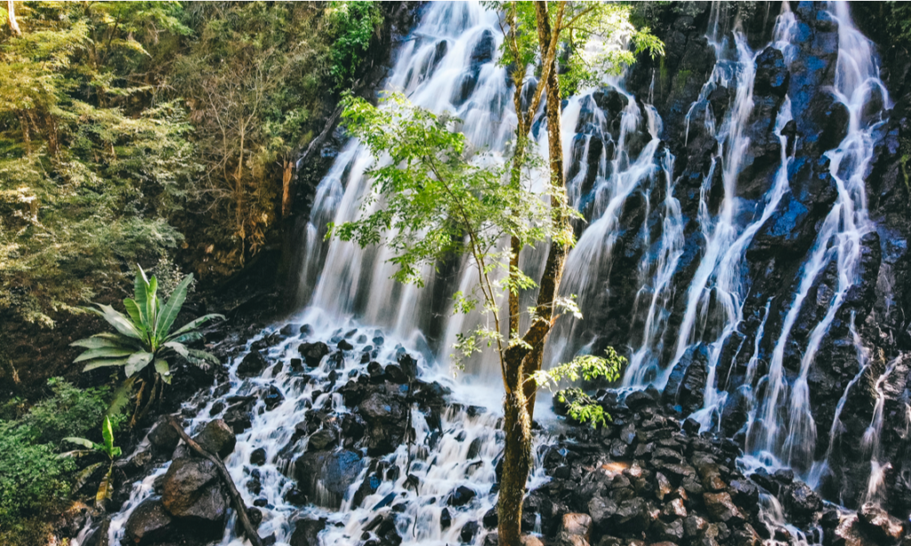 Cascada Velo de Novia, una caída de agua de 35 metros, rodeada de un espeso bosque verde o el