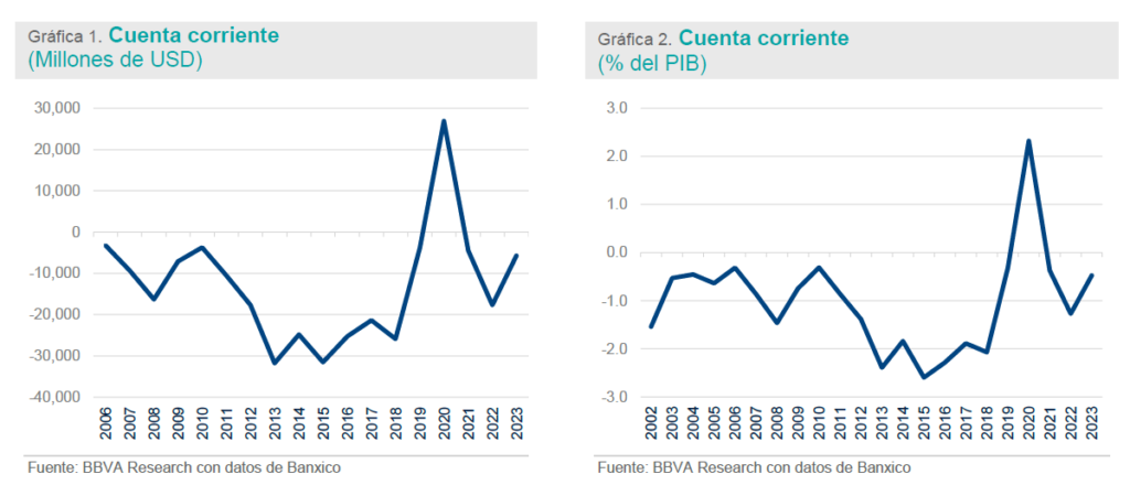 Después de haber registrado un déficit de 17.7 mil millones de USD en 2022, la cuenta corriente mostró un déficit de 5.7 mil millones de USD en 2023 (Gráfica 1). En términos de PIB, el déficit de cuenta corriente se ubicó en 0.5% (Gráfica 2). La información correspondiente al cuarto trimestre de 2023 indica que la cuenta corriente registró un superávit de 11.7 mil millones de USD, cuya cifra anualizada equivaldría a 2.46% del PIB. Para 2024 prevemos que la cuenta corriente muestre un déficit de aproximadamente 12.0 mil millones de USD (0.7% del PIB).