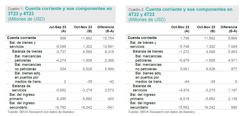 El superávit de cuenta corriente en el cuarto trimestre de 2023 fue mayor a la cifra correspondiente al mismo lapso de 2022 debido principalmente al menor déficit en la balanza de mercancías petroleras